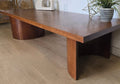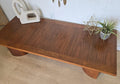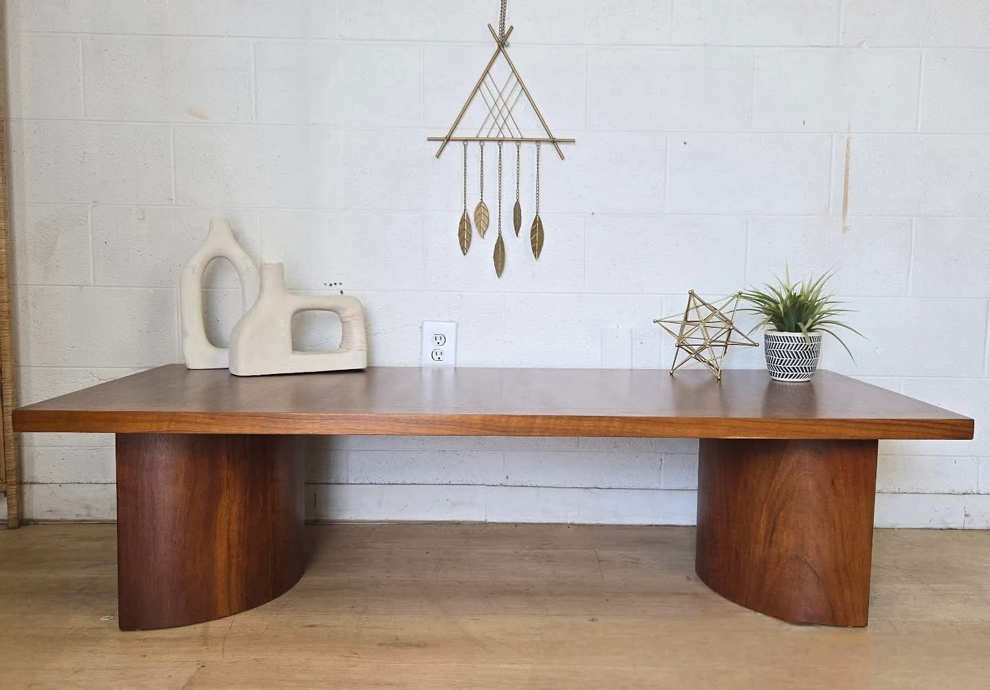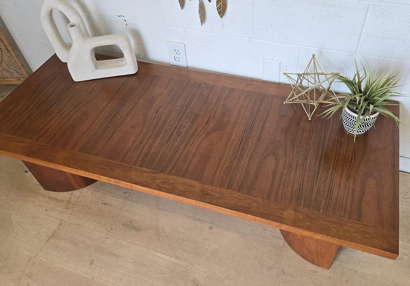 A standout piece of American mid-century modern design, this Kroehler walnut coffee table features a striking architectural profile with bold, sculptural base elements. The curved, cylindrical legs give the piece a grounded, modernist feel — a subtle nod to brutalist and postmodern design influences of the late 1960s and early '70s.